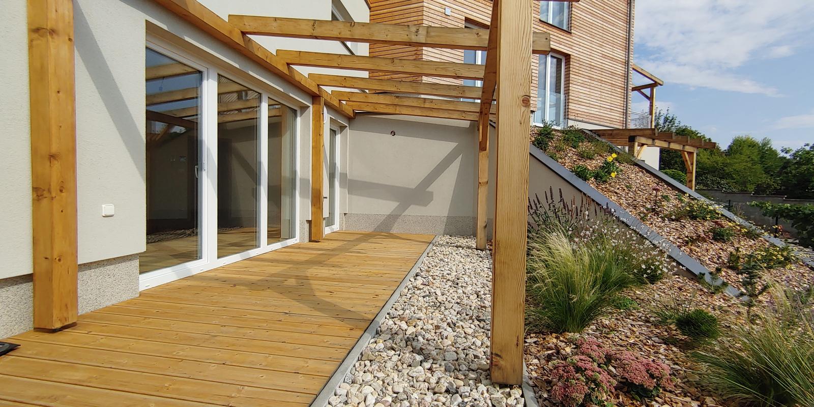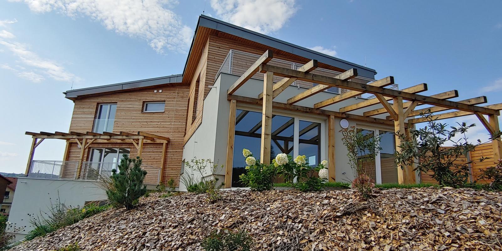 Podzemní podlaží je železobetonové konstrukce, svislé nosné stěny nadzemních podlaží jsou provedeny z cihelných bloků, stropy jsou železobetonové. Konstrukce zastřešení pultová s fóliovou krytinou. Obvodový plášť s tepelnou izolací 160 mm, okna trojskla. V projektu energ. náročnost třída B - velmi úsporná. Tím, že jsme původně navržené plynové kotle (byl to rok 2022) nahradili kotli elektrickými změnila se třída na E - nehospodárná. Konstrukce domu zůstaly stejné a energetická náročnost na vytápění je 66 kWh/m2/rok. Myslíte si o metodice PENB to co my? :-))) Vytápění je podlahové, každá jednotka má vlastní elektrický kotel. Každý byt má navíc vlastní komínové těleso Schiedel umožňující instalaci krbu nebo kamen. TZB obvyklý standard včetně datových rozvodů, připojení na internet, STA, příprava pro nabíjení elektromobilů.