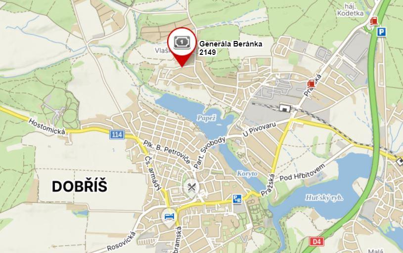 Město Dobříš snad není třeba detailně představovat. Jde o známé atraktivní místo k bydlení s velmi dobrým dopravním spojením s Prahou a současně s vlastní kvalitní infrastrukturou. Dům je postaven v ulici Generála Beránka. Ta je součástí lokality se zástavbou rodinnými domy se zahradami na jižním svahu nad rybníkem Papež.